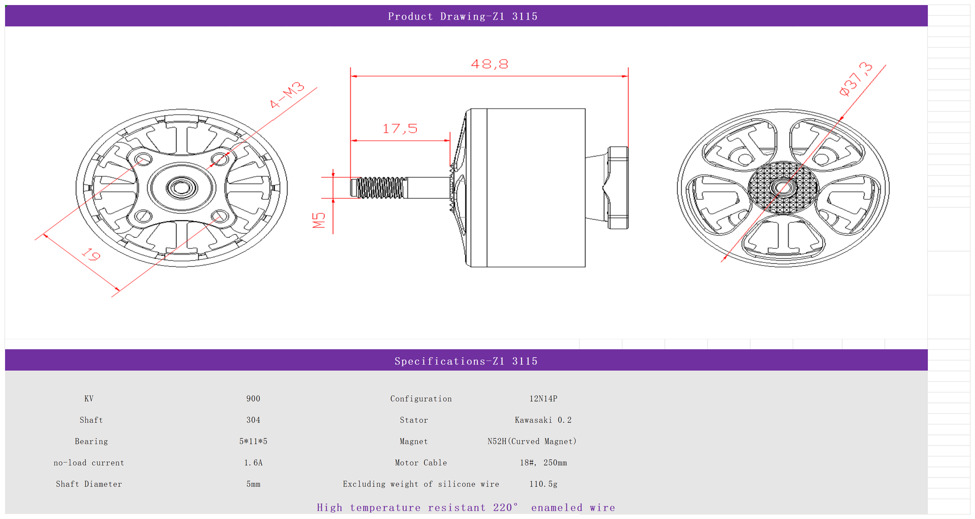 This motor adopts 6061 national standard aluminum and oxide two-color, magnet adopts the strongest performance N52SH arc magnetic sheet, copper wire adopts high temperature resistant 220° military enameled wire, and bearings adopt NMB685.