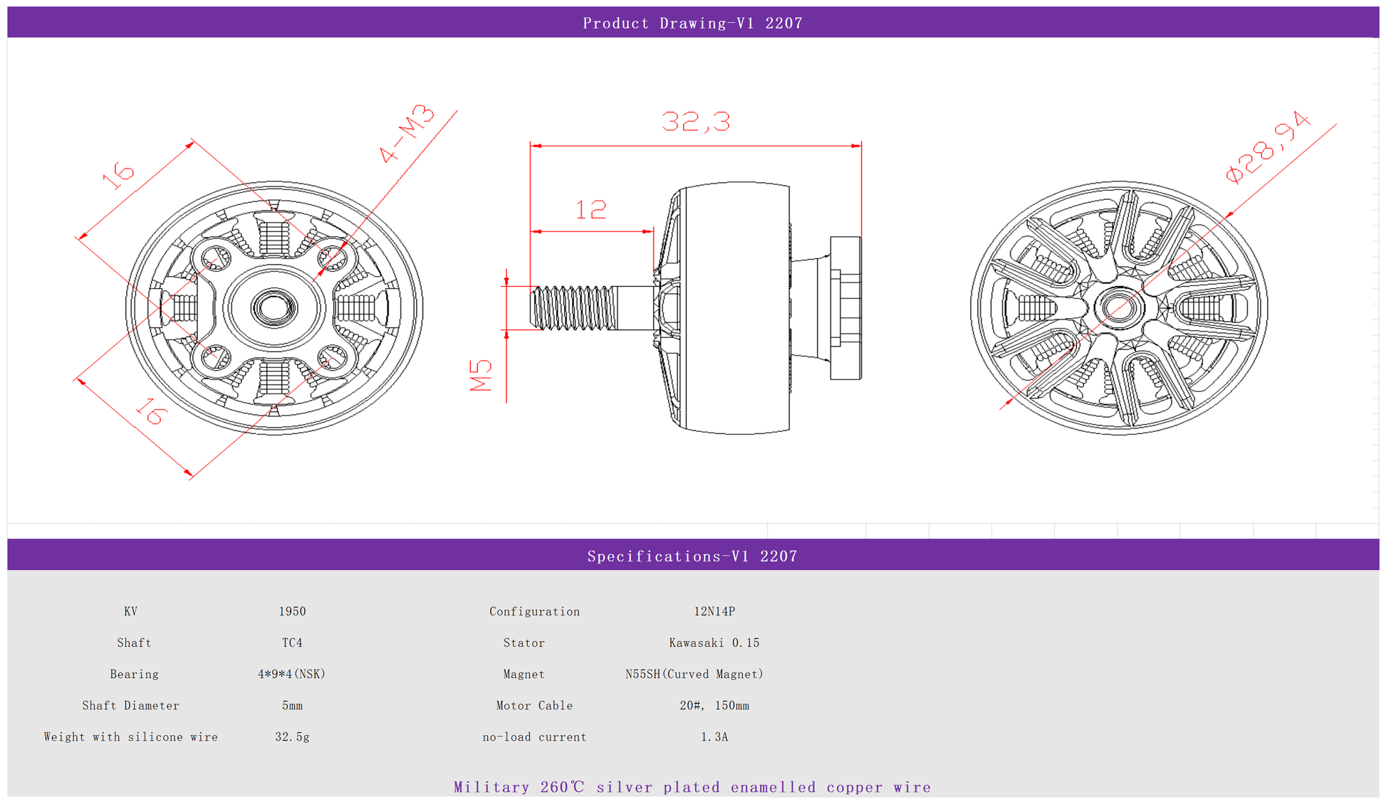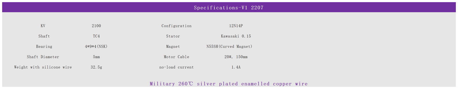 This motor adopts 6061 national standard aluminum, oxide two-color, magnet adopts the strongest performance N55SH arc magnetic sheet, copper wire adopts high temperature resistant 260° military silver-plated wire, bearing adopts NSK684.