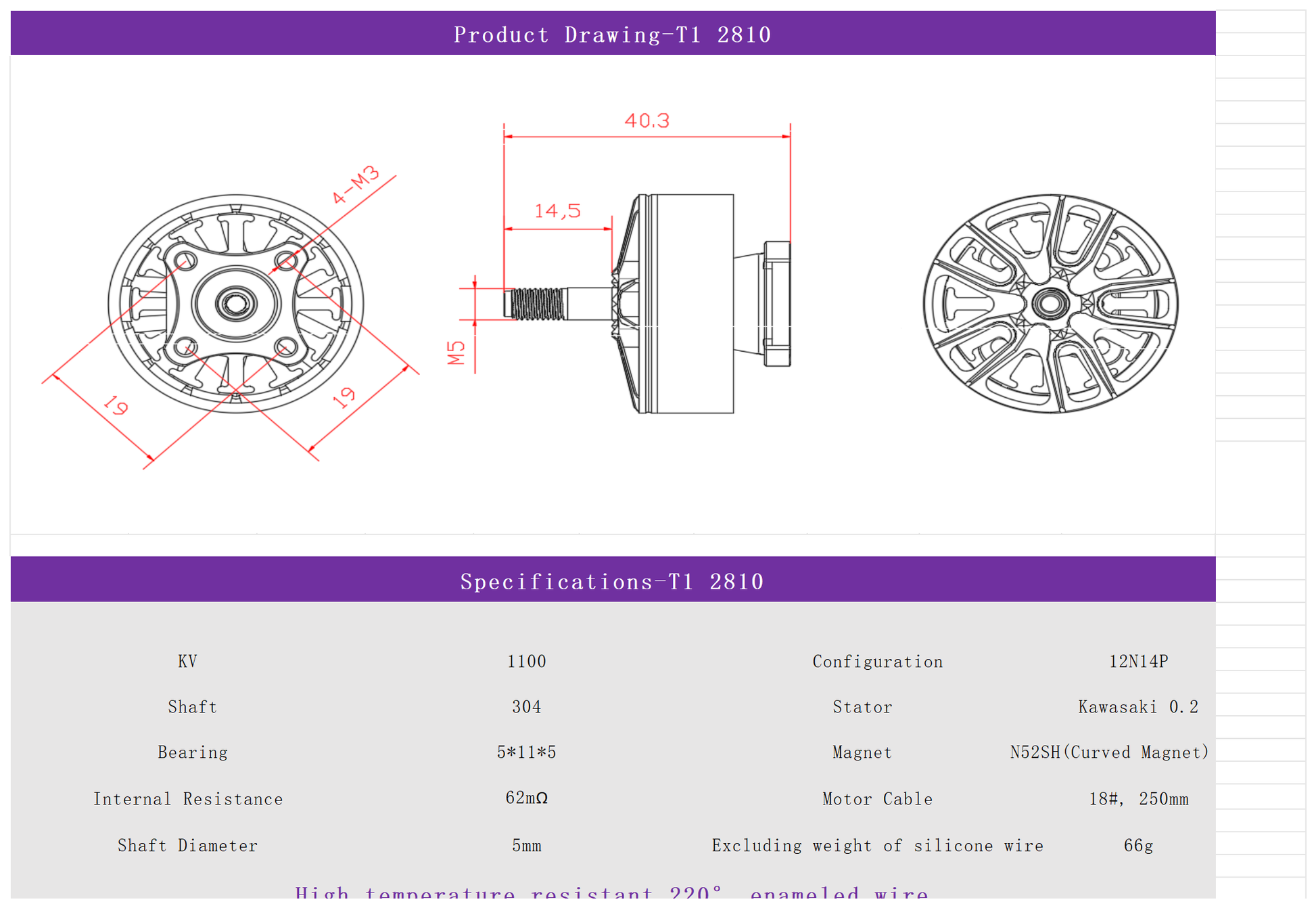 This motor adopts 6061 national standard aluminum and oxide two-color, magnet adopts the strongest performance N52SH arc magnetic sheet, copper wire adopts high temperature resistant 220° military enameled wire, and bearings adopt NMB685.
